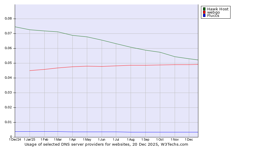 TechnologiesContent ManagementServer-side Languages Client-side Languages JavaScript Libraries CSS Frameworks Web Servers Web Panels Operating Systems Web Hosting Data Centers Reverse Proxies DNS Servers Email Servers SSL Certificate Authorities Content Delivery Traffic Analysis Tools Advertising Networks Tag Managers Social Widgets Site Elements Structured Data Markup Languages Character Encodings Image File Formats Top Level Domains Server Locations Content Languages | Technologies > DNS Servers > Technology usage comparison Comparison of the usage statistics of Hawk Host vs. webgo vs. Fluccs for websitesThis report shows the usage statistics of Hawk Host vs. webgo vs. Fluccs as DNS server provider on the web. See technologies overview for explanations on the methodologies used in the surveys. Our reports are updated daily. UsageThis diagram shows the percentages of websites using the selected technologies. How to read the diagram:
