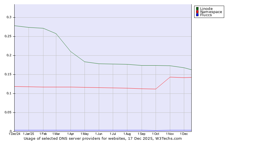 TechnologiesContent ManagementServer-side Languages Client-side Languages JavaScript Libraries CSS Frameworks Web Servers Web Panels Operating Systems Web Hosting Data Centers Reverse Proxies DNS Servers Email Servers SSL Certificate Authorities Content Delivery Traffic Analysis Tools Advertising Networks Tag Managers Social Widgets Site Elements Structured Data Markup Languages Character Encodings Image File Formats Top Level Domains Server Locations Content Languages | Technologies > DNS Servers > Technology usage comparison Comparison of the usage statistics of Linode vs. Namespace vs. Fluccs for websitesThis report shows the usage statistics of Linode vs. Namespace vs. Fluccs as DNS server provider on the web. See technologies overview for explanations on the methodologies used in the surveys. Our reports are updated daily. UsageThis diagram shows the percentages of websites using the selected technologies. How to read the diagram:
