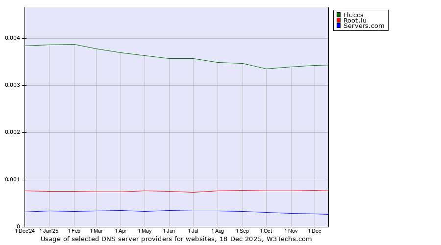 TechnologiesContent ManagementServer-side Languages Client-side Languages JavaScript Libraries CSS Frameworks Web Servers Web Panels Operating Systems Web Hosting Data Centers Reverse Proxies DNS Servers Email Servers SSL Certificate Authorities Content Delivery Traffic Analysis Tools Advertising Networks Tag Managers Social Widgets Site Elements Structured Data Markup Languages Character Encodings Image File Formats Top Level Domains Server Locations Content Languages | Technologies > DNS Servers > Technology usage comparison Comparison of the usage statistics of Fluccs vs. Root.lu vs. Servers.com for websitesThis report shows the usage statistics of Fluccs vs. Root.lu vs. Servers.com as DNS server provider on the web. See technologies overview for explanations on the methodologies used in the surveys. Our reports are updated daily. UsageThis diagram shows the percentages of websites using the selected technologies. How to read the diagram: