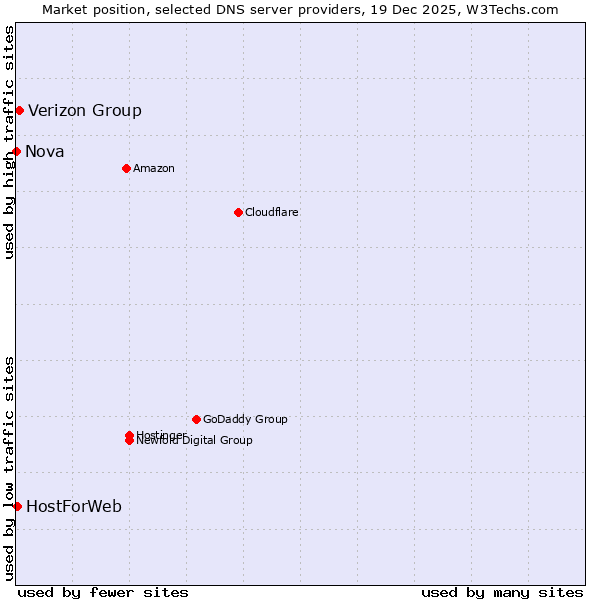 TechnologiesContent ManagementServer-side Languages Client-side Languages JavaScript Libraries CSS Frameworks Web Servers Web Panels Operating Systems Web Hosting Data Centers Reverse Proxies DNS Servers Email Servers SSL Certificate Authorities Content Delivery Traffic Analysis Tools Advertising Networks Tag Managers Social Widgets Site Elements Structured Data Markup Languages Character Encodings Image File Formats Top Level Domains Server Locations Content Languages | Technologies > DNS Servers > Technology usage comparison Comparison of the usage statistics of Verizon Group vs. HostForWeb vs. Nova for websitesThis report shows the usage statistics of Verizon Group vs. HostForWeb vs. Nova as DNS server provider on the web. See technologies overview for explanations on the methodologies used in the surveys. Our reports are updated daily. UsageThis diagram shows the percentages of websites using the selected technologies. How to read the diagram: