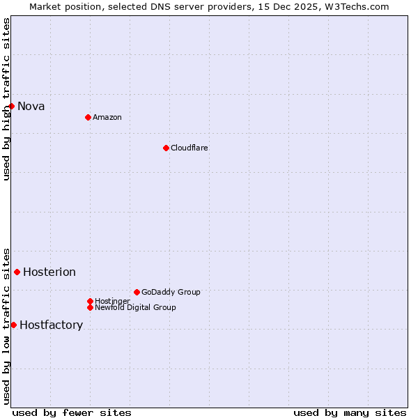 TechnologiesContent ManagementServer-side Languages Client-side Languages JavaScript Libraries CSS Frameworks Web Servers Web Panels Operating Systems Web Hosting Data Centers Reverse Proxies DNS Servers Email Servers SSL Certificate Authorities Content Delivery Traffic Analysis Tools Advertising Networks Tag Managers Social Widgets Site Elements Structured Data Markup Languages Character Encodings Image File Formats Top Level Domains Server Locations Content Languages | Technologies > DNS Servers > Technology usage comparison Comparison of the usage statistics of Hosterion vs. Hostfactory vs. Nova for websitesThis report shows the usage statistics of Hosterion vs. Hostfactory vs. Nova as DNS server provider on the web. See technologies overview for explanations on the methodologies used in the surveys. Our reports are updated daily. UsageThis diagram shows the percentages of websites using the selected technologies. How to read the diagram: