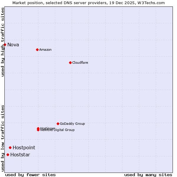 TechnologiesContent ManagementServer-side Languages Client-side Languages JavaScript Libraries CSS Frameworks Web Servers Web Panels Operating Systems Web Hosting Data Centers Reverse Proxies DNS Servers Email Servers SSL Certificate Authorities Content Delivery Traffic Analysis Tools Advertising Networks Tag Managers Social Widgets Site Elements Structured Data Markup Languages Character Encodings Image File Formats Top Level Domains Server Locations Content Languages | Technologies > DNS Servers > Technology usage comparison Comparison of the usage statistics of Hostpoint vs. Hoststar vs. Nova for websitesThis report shows the usage statistics of Hostpoint vs. Hoststar vs. Nova as DNS server provider on the web. See technologies overview for explanations on the methodologies used in the surveys. Our reports are updated daily. UsageThis diagram shows the percentages of websites using the selected technologies. How to read the diagram: