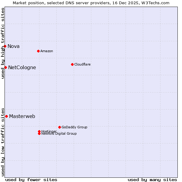 TechnologiesContent ManagementServer-side Languages Client-side Languages JavaScript Libraries CSS Frameworks Web Servers Web Panels Operating Systems Web Hosting Data Centers Reverse Proxies DNS Servers Email Servers SSL Certificate Authorities Content Delivery Traffic Analysis Tools Advertising Networks Tag Managers Social Widgets Site Elements Structured Data Markup Languages Character Encodings Image File Formats Top Level Domains Server Locations Content Languages | Technologies > DNS Servers > Technology usage comparison Comparison of the usage statistics of Masterweb vs. NetCologne vs. Nova for websitesThis report shows the usage statistics of Masterweb vs. NetCologne vs. Nova as DNS server provider on the web. See technologies overview for explanations on the methodologies used in the surveys. Our reports are updated daily. UsageThis diagram shows the percentages of websites using the selected technologies. How to read the diagram: