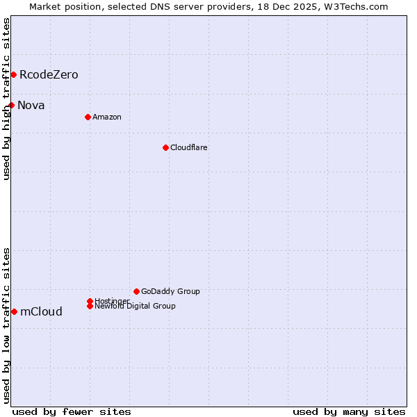 TechnologiesContent ManagementServer-side Languages Client-side Languages JavaScript Libraries CSS Frameworks Web Servers Web Panels Operating Systems Web Hosting Data Centers Reverse Proxies DNS Servers Email Servers SSL Certificate Authorities Content Delivery Traffic Analysis Tools Advertising Networks Tag Managers Social Widgets Site Elements Structured Data Markup Languages Character Encodings Image File Formats Top Level Domains Server Locations Content Languages | Technologies > DNS Servers > Technology usage comparison Comparison of the usage statistics of mCloud vs. RcodeZero vs. Nova for websitesThis report shows the usage statistics of mCloud vs. RcodeZero vs. Nova as DNS server provider on the web. See technologies overview for explanations on the methodologies used in the surveys. Our reports are updated daily. UsageThis diagram shows the percentages of websites using the selected technologies. How to read the diagram: