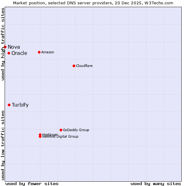 TechnologiesContent ManagementServer-side Languages Client-side Languages JavaScript Libraries CSS Frameworks Web Servers Web Panels Operating Systems Web Hosting Data Centers Reverse Proxies DNS Servers Email Servers SSL Certificate Authorities Content Delivery Traffic Analysis Tools Advertising Networks Tag Managers Social Widgets Site Elements Structured Data Markup Languages Character Encodings Image File Formats Top Level Domains Server Locations Content Languages | Technologies > DNS Servers > Technology usage comparison Comparison of the usage statistics of Turbify vs. Oracle vs. Nova for websitesThis report shows the usage statistics of Turbify vs. Oracle vs. Nova as DNS server provider on the web. See technologies overview for explanations on the methodologies used in the surveys. Our reports are updated daily. UsageThis diagram shows the percentages of websites using the selected technologies. How to read the diagram: