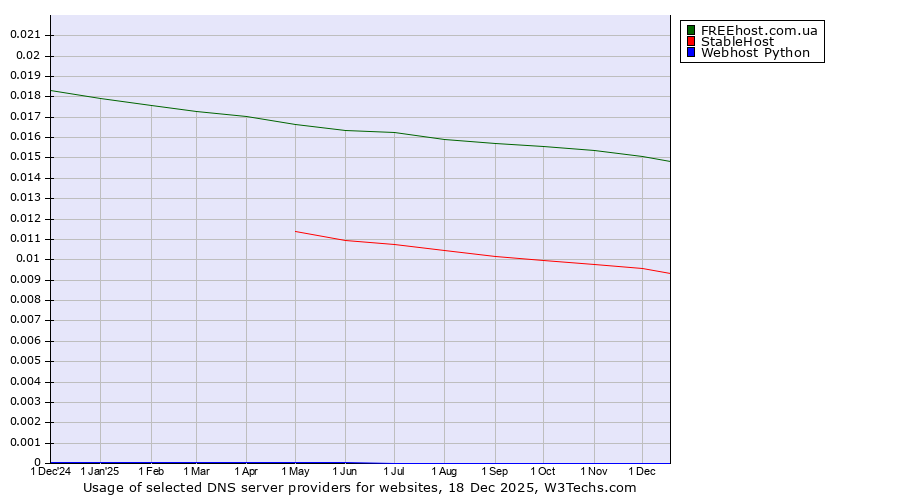 TechnologiesContent ManagementServer-side Languages Client-side Languages JavaScript Libraries CSS Frameworks Web Servers Web Panels Operating Systems Web Hosting Data Centers Reverse Proxies DNS Servers Email Servers SSL Certificate Authorities Content Delivery Traffic Analysis Tools Advertising Networks Tag Managers Social Widgets Site Elements Structured Data Markup Languages Character Encodings Image File Formats Top Level Domains Server Locations Content Languages | Technologies > DNS Servers > Technology usage comparison Comparison of the usage statistics of FREEhost.com.ua vs. StableHost vs. Webhost Python for websitesThis report shows the usage statistics of FREEhost.com.ua vs. StableHost vs. Webhost Python as DNS server provider on the web. See technologies overview for explanations on the methodologies used in the surveys. Our reports are updated daily. UsageThis diagram shows the percentages of websites using the selected technologies. How to read the diagram: