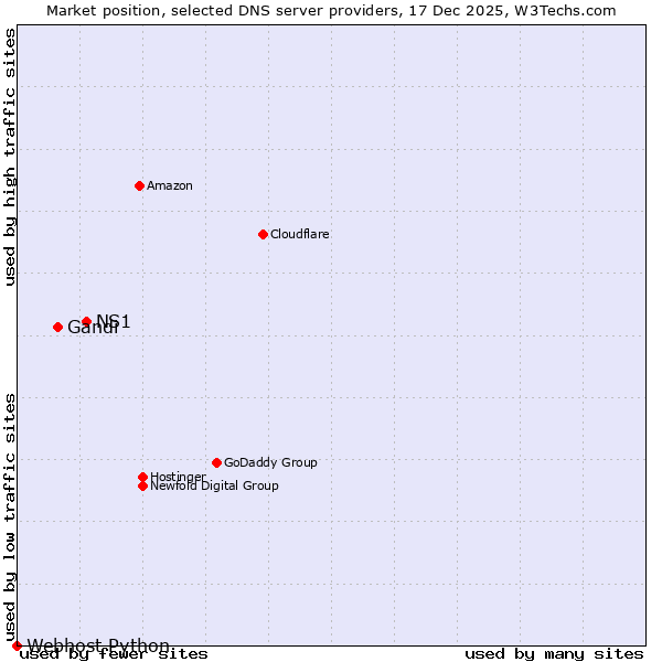 TechnologiesContent ManagementServer-side Languages Client-side Languages JavaScript Libraries CSS Frameworks Web Servers Web Panels Operating Systems Web Hosting Data Centers Reverse Proxies DNS Servers Email Servers SSL Certificate Authorities Content Delivery Traffic Analysis Tools Advertising Networks Tag Managers Social Widgets Site Elements Structured Data Markup Languages Character Encodings Image File Formats Top Level Domains Server Locations Content Languages | Technologies > DNS Servers > Technology usage comparison Comparison of the usage statistics of NS1 vs. Gandi vs. Webhost Python for websitesThis report shows the usage statistics of NS1 vs. Gandi vs. Webhost Python as DNS server provider on the web. See technologies overview for explanations on the methodologies used in the surveys. Our reports are updated daily. UsageThis diagram shows the percentages of websites using the selected technologies. How to read the diagram: