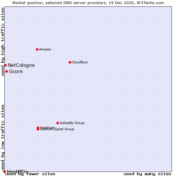 TechnologiesContent ManagementServer-side Languages Client-side Languages JavaScript Libraries CSS Frameworks Web Servers Web Panels Operating Systems Web Hosting Data Centers Reverse Proxies DNS Servers Email Servers SSL Certificate Authorities Content Delivery Traffic Analysis Tools Advertising Networks Tag Managers Social Widgets Site Elements Structured Data Markup Languages Character Encodings Image File Formats Top Level Domains Server Locations Content Languages | Technologies > DNS Servers > Technology usage comparison Comparison of the usage statistics of Gcore vs. NetCologne vs. HostMDs for websitesThis report shows the usage statistics of Gcore vs. NetCologne vs. HostMDs as DNS server provider on the web. See technologies overview for explanations on the methodologies used in the surveys. Our reports are updated daily. UsageThis diagram shows the percentages of websites using the selected technologies. How to read the diagram: