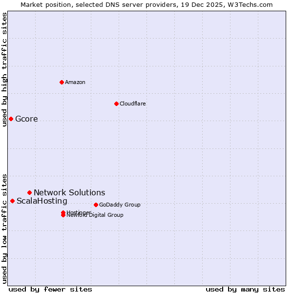 TechnologiesContent ManagementServer-side Languages Client-side Languages JavaScript Libraries CSS Frameworks Web Servers Web Panels Operating Systems Web Hosting Data Centers Reverse Proxies DNS Servers Email Servers SSL Certificate Authorities Content Delivery Traffic Analysis Tools Advertising Networks Tag Managers Social Widgets Site Elements Structured Data Markup Languages Character Encodings Image File Formats Top Level Domains Server Locations Content Languages | Technologies > DNS Servers > Technology usage comparison Comparison of the usage statistics of Network Solutions vs. ScalaHosting vs. Gcore for websitesThis report shows the usage statistics of Network Solutions vs. ScalaHosting vs. Gcore as DNS server provider on the web. See technologies overview for explanations on the methodologies used in the surveys. Our reports are updated daily. UsageThis diagram shows the percentages of websites using the selected technologies. How to read the diagram: