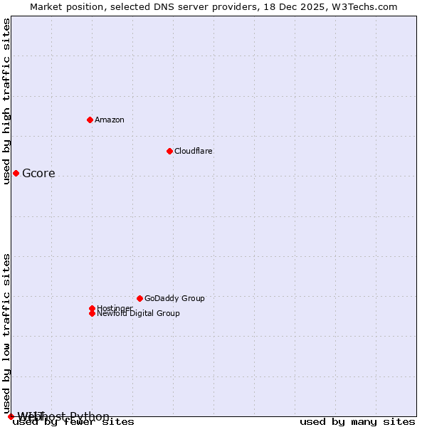 TechnologiesContent ManagementServer-side Languages Client-side Languages JavaScript Libraries CSS Frameworks Web Servers Web Panels Operating Systems Web Hosting Data Centers Reverse Proxies DNS Servers Email Servers SSL Certificate Authorities Content Delivery Traffic Analysis Tools Advertising Networks Tag Managers Social Widgets Site Elements Structured Data Markup Languages Character Encodings Image File Formats Top Level Domains Server Locations Content Languages | Technologies > DNS Servers > Technology usage comparison Comparison of the usage statistics of Gcore vs. WIIT vs. Webhost Python for websitesThis report shows the usage statistics of Gcore vs. WIIT vs. Webhost Python as DNS server provider on the web. See technologies overview for explanations on the methodologies used in the surveys. Our reports are updated daily. UsageThis diagram shows the percentages of websites using the selected technologies. How to read the diagram: