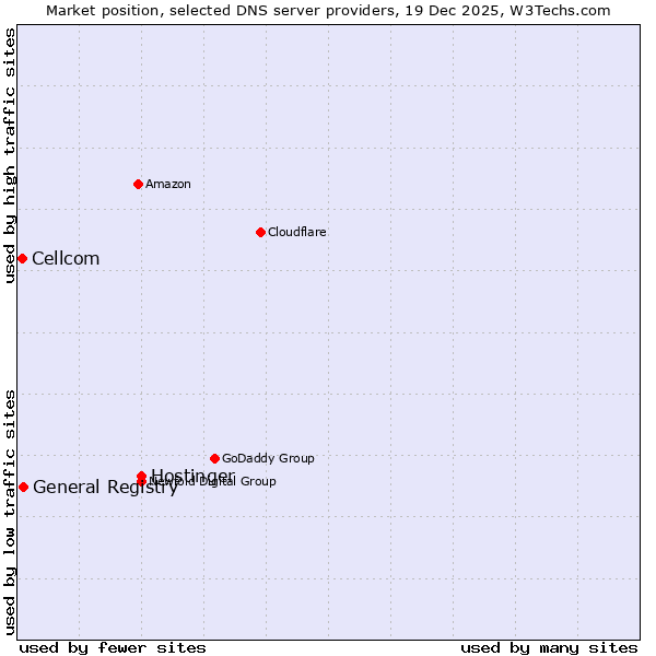 TechnologiesContent ManagementServer-side Languages Client-side Languages JavaScript Libraries CSS Frameworks Web Servers Web Panels Operating Systems Web Hosting Data Centers Reverse Proxies DNS Servers Email Servers SSL Certificate Authorities Content Delivery Traffic Analysis Tools Advertising Networks Tag Managers Social Widgets Site Elements Structured Data Markup Languages Character Encodings Image File Formats Top Level Domains Server Locations Content Languages | Technologies > DNS Servers > Technology usage comparison Comparison of the usage statistics of Hostinger vs. General Registry vs. Cellcom for websitesThis report shows the usage statistics of Hostinger vs. General Registry vs. Cellcom as DNS server provider on the web. See technologies overview for explanations on the methodologies used in the surveys. Our reports are updated daily. UsageThis diagram shows the percentages of websites using the selected technologies. How to read the diagram: