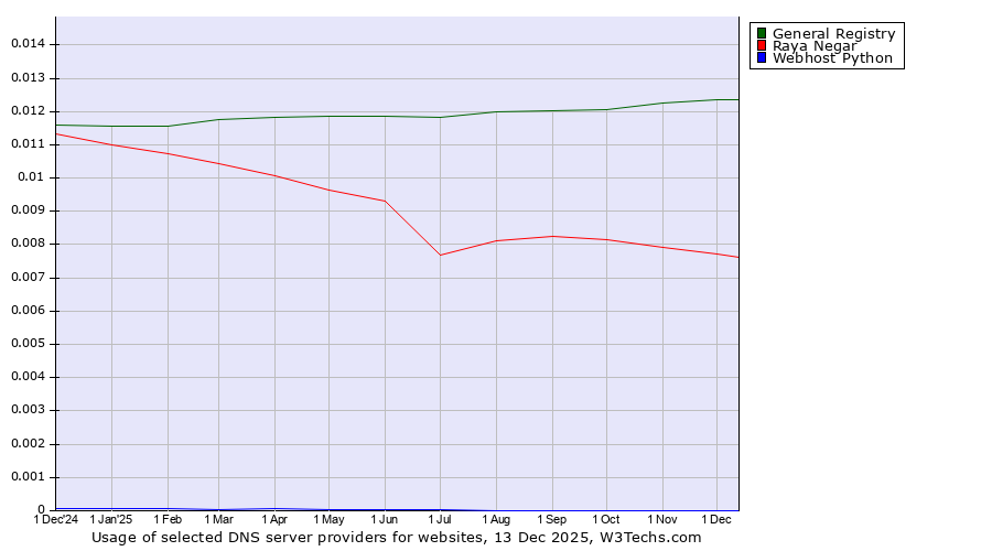 TechnologiesContent ManagementServer-side Languages Client-side Languages JavaScript Libraries CSS Frameworks Web Servers Web Panels Operating Systems Web Hosting Data Centers Reverse Proxies DNS Servers Email Servers SSL Certificate Authorities Content Delivery Traffic Analysis Tools Advertising Networks Tag Managers Social Widgets Site Elements Structured Data Markup Languages Character Encodings Image File Formats Top Level Domains Server Locations Content Languages | Technologies > DNS Servers > Technology usage comparison Comparison of the usage statistics of General Registry vs. Raya Negar vs. Webhost Python for websitesThis report shows the usage statistics of General Registry vs. Raya Negar vs. Webhost Python as DNS server provider on the web. See technologies overview for explanations on the methodologies used in the surveys. Our reports are updated daily. UsageThis diagram shows the percentages of websites using the selected technologies. How to read the diagram: