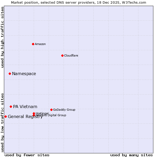 TechnologiesContent ManagementServer-side Languages Client-side Languages JavaScript Libraries CSS Frameworks Web Servers Web Panels Operating Systems Web Hosting Data Centers Reverse Proxies DNS Servers Email Servers SSL Certificate Authorities Content Delivery Traffic Analysis Tools Advertising Networks Tag Managers Social Widgets Site Elements Structured Data Markup Languages Character Encodings Image File Formats Top Level Domains Server Locations Content Languages | Technologies > DNS Servers > Technology usage comparison Comparison of the usage statistics of PA Vietnam vs. Namespace vs. General Registry for websitesThis report shows the usage statistics of PA Vietnam vs. Namespace vs. General Registry as DNS server provider on the web. See technologies overview for explanations on the methodologies used in the surveys. Our reports are updated daily. UsageThis diagram shows the percentages of websites using the selected technologies. How to read the diagram: