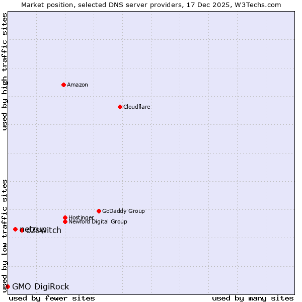 TechnologiesContent ManagementServer-side Languages Client-side Languages JavaScript Libraries CSS Frameworks Web Servers Web Panels Operating Systems Web Hosting Data Centers Reverse Proxies DNS Servers Email Servers SSL Certificate Authorities Content Delivery Traffic Analysis Tools Advertising Networks Tag Managers Social Widgets Site Elements Structured Data Markup Languages Character Encodings Image File Formats Top Level Domains Server Locations Content Languages | Technologies > DNS Servers > Technology usage comparison Comparison of the usage statistics of o2switch vs. netcup vs. GMO DigiRock for websitesThis report shows the usage statistics of o2switch vs. netcup vs. GMO DigiRock as DNS server provider on the web. See technologies overview for explanations on the methodologies used in the surveys. Our reports are updated daily. UsageThis diagram shows the percentages of websites using the selected technologies. How to read the diagram: