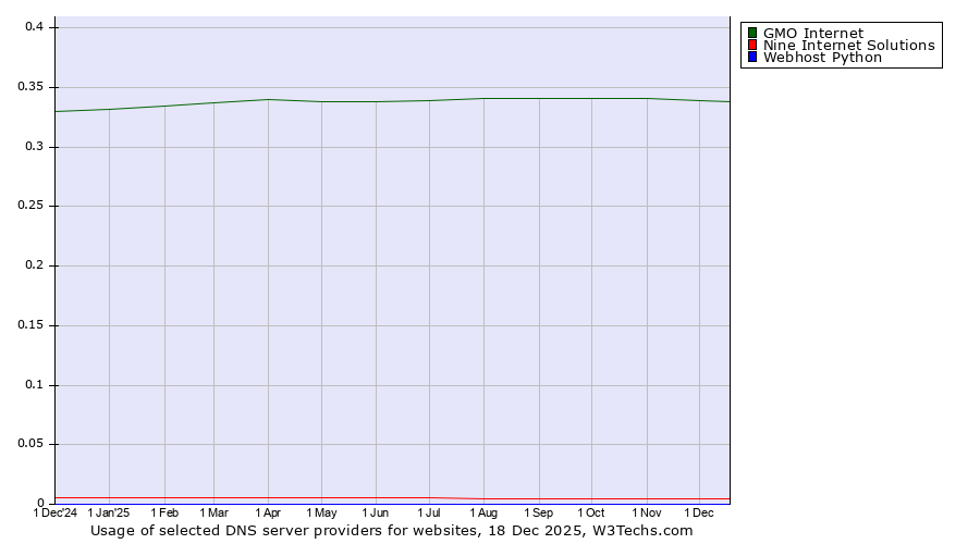 TechnologiesContent ManagementServer-side Languages Client-side Languages JavaScript Libraries CSS Frameworks Web Servers Web Panels Operating Systems Web Hosting Data Centers Reverse Proxies DNS Servers Email Servers SSL Certificate Authorities Content Delivery Traffic Analysis Tools Advertising Networks Tag Managers Social Widgets Site Elements Structured Data Markup Languages Character Encodings Image File Formats Top Level Domains Server Locations Content Languages | Technologies > DNS Servers > Technology usage comparison Comparison of the usage statistics of GMO Internet vs. Nine Internet Solutions vs. Webhost Python for websitesThis report shows the usage statistics of GMO Internet vs. Nine Internet Solutions vs. Webhost Python as DNS server provider on the web. See technologies overview for explanations on the methodologies used in the surveys. Our reports are updated daily. UsageThis diagram shows the percentages of websites using the selected technologies. How to read the diagram: