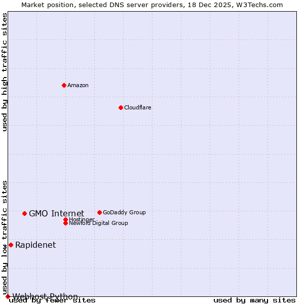 TechnologiesContent ManagementServer-side Languages Client-side Languages JavaScript Libraries CSS Frameworks Web Servers Web Panels Operating Systems Web Hosting Data Centers Reverse Proxies DNS Servers Email Servers SSL Certificate Authorities Content Delivery Traffic Analysis Tools Advertising Networks Tag Managers Social Widgets Site Elements Structured Data Markup Languages Character Encodings Image File Formats Top Level Domains Server Locations Content Languages | Technologies > DNS Servers > Technology usage comparison Comparison of the usage statistics of GMO Internet vs. Rapidenet vs. Webhost Python for websitesThis report shows the usage statistics of GMO Internet vs. Rapidenet vs. Webhost Python as DNS server provider on the web. See technologies overview for explanations on the methodologies used in the surveys. Our reports are updated daily. UsageThis diagram shows the percentages of websites using the selected technologies. How to read the diagram:
