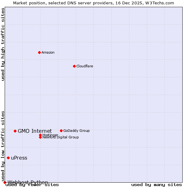TechnologiesContent ManagementServer-side Languages Client-side Languages JavaScript Libraries CSS Frameworks Web Servers Web Panels Operating Systems Web Hosting Data Centers Reverse Proxies DNS Servers Email Servers SSL Certificate Authorities Content Delivery Traffic Analysis Tools Advertising Networks Tag Managers Social Widgets Site Elements Structured Data Markup Languages Character Encodings Image File Formats Top Level Domains Server Locations Content Languages | Technologies > DNS Servers > Technology usage comparison Comparison of the usage statistics of GMO Internet vs. uPress vs. Webhost Python for websitesThis report shows the usage statistics of GMO Internet vs. uPress vs. Webhost Python as DNS server provider on the web. See technologies overview for explanations on the methodologies used in the surveys. Our reports are updated daily. UsageThis diagram shows the percentages of websites using the selected technologies. How to read the diagram: