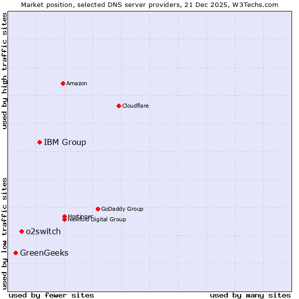 TechnologiesContent ManagementServer-side Languages Client-side Languages JavaScript Libraries CSS Frameworks Web Servers Web Panels Operating Systems Web Hosting Data Centers Reverse Proxies DNS Servers Email Servers SSL Certificate Authorities Content Delivery Traffic Analysis Tools Advertising Networks Tag Managers Social Widgets Site Elements Structured Data Markup Languages Character Encodings Image File Formats Top Level Domains Server Locations Content Languages | Technologies > DNS Servers > Technology usage comparison Comparison of the usage statistics of IBM Group vs. o2switch vs. GreenGeeks for websitesThis report shows the usage statistics of IBM Group vs. o2switch vs. GreenGeeks as DNS server provider on the web. See technologies overview for explanations on the methodologies used in the surveys. Our reports are updated daily. UsageThis diagram shows the percentages of websites using the selected technologies. How to read the diagram: