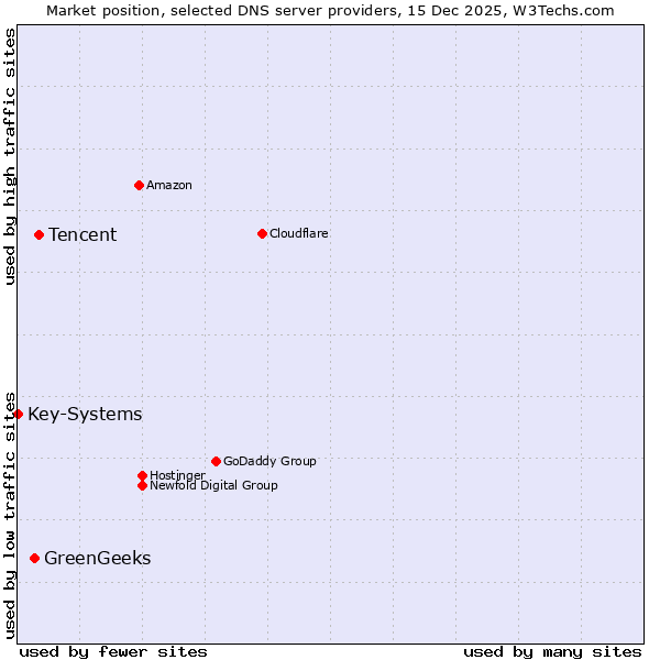 TechnologiesContent ManagementServer-side Languages Client-side Languages JavaScript Libraries CSS Frameworks Web Servers Web Panels Operating Systems Web Hosting Data Centers Reverse Proxies DNS Servers Email Servers SSL Certificate Authorities Content Delivery Traffic Analysis Tools Advertising Networks Tag Managers Social Widgets Site Elements Structured Data Markup Languages Character Encodings Image File Formats Top Level Domains Server Locations Content Languages | Technologies > DNS Servers > Technology usage comparison Comparison of the usage statistics of Tencent vs. GreenGeeks vs. Key-Systems for websitesThis report shows the usage statistics of Tencent vs. GreenGeeks vs. Key-Systems as DNS server provider on the web. See technologies overview for explanations on the methodologies used in the surveys. Our reports are updated daily. UsageThis diagram shows the percentages of websites using the selected technologies. How to read the diagram: