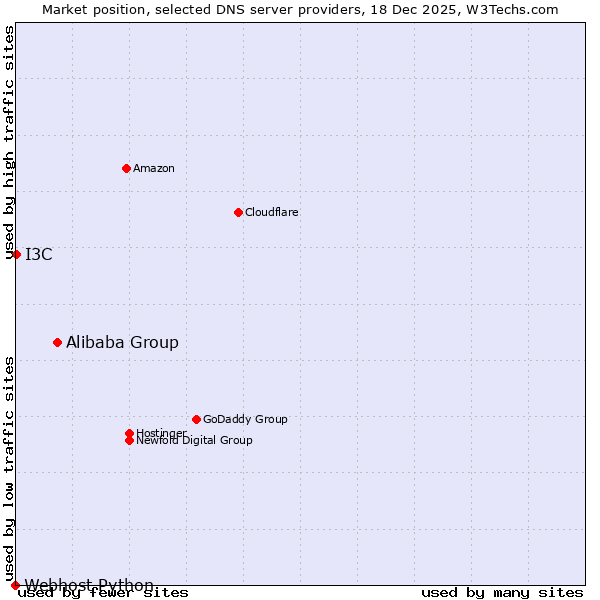 TechnologiesContent ManagementServer-side Languages Client-side Languages JavaScript Libraries CSS Frameworks Web Servers Web Panels Operating Systems Web Hosting Data Centers Reverse Proxies DNS Servers Email Servers SSL Certificate Authorities Content Delivery Traffic Analysis Tools Advertising Networks Tag Managers Social Widgets Site Elements Structured Data Markup Languages Character Encodings Image File Formats Top Level Domains Server Locations Content Languages | Technologies > DNS Servers > Technology usage comparison Comparison of the usage statistics of Alibaba Group vs. I3C vs. Webhost Python for websitesThis report shows the usage statistics of Alibaba Group vs. I3C vs. Webhost Python as DNS server provider on the web. See technologies overview for explanations on the methodologies used in the surveys. Our reports are updated daily. UsageThis diagram shows the percentages of websites using the selected technologies. How to read the diagram: