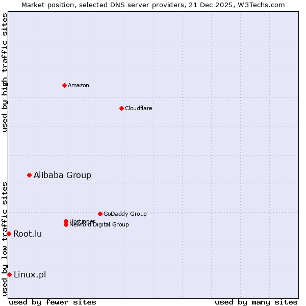 TechnologiesContent ManagementServer-side Languages Client-side Languages JavaScript Libraries CSS Frameworks Web Servers Web Panels Operating Systems Web Hosting Data Centers Reverse Proxies DNS Servers Email Servers SSL Certificate Authorities Content Delivery Traffic Analysis Tools Advertising Networks Tag Managers Social Widgets Site Elements Structured Data Markup Languages Character Encodings Image File Formats Top Level Domains Server Locations Content Languages | Technologies > DNS Servers > Technology usage comparison Comparison of the usage statistics of Alibaba Group vs. Linux.pl vs. Root.lu for websitesThis report shows the usage statistics of Alibaba Group vs. Linux.pl vs. Root.lu as DNS server provider on the web. See technologies overview for explanations on the methodologies used in the surveys. Our reports are updated daily. UsageThis diagram shows the percentages of websites using the selected technologies. How to read the diagram: