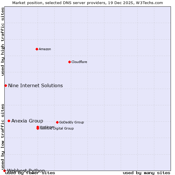 TechnologiesContent ManagementServer-side Languages Client-side Languages JavaScript Libraries CSS Frameworks Web Servers Web Panels Operating Systems Web Hosting Data Centers Reverse Proxies DNS Servers Email Servers SSL Certificate Authorities Content Delivery Traffic Analysis Tools Advertising Networks Tag Managers Social Widgets Site Elements Structured Data Markup Languages Character Encodings Image File Formats Top Level Domains Server Locations Content Languages | Technologies > DNS Servers > Technology usage comparison Comparison of the usage statistics of Anexia Group vs. Nine Internet Solutions vs. Webhost Python for websitesThis report shows the usage statistics of Anexia Group vs. Nine Internet Solutions vs. Webhost Python as DNS server provider on the web. See technologies overview for explanations on the methodologies used in the surveys. Our reports are updated daily. UsageThis diagram shows the percentages of websites using the selected technologies. How to read the diagram:
