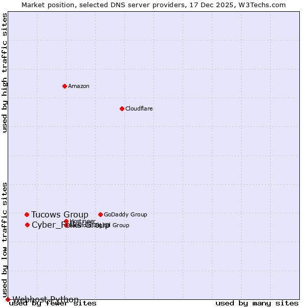 TechnologiesContent ManagementServer-side Languages Client-side Languages JavaScript Libraries CSS Frameworks Web Servers Web Panels Operating Systems Web Hosting Data Centers Reverse Proxies DNS Servers Email Servers SSL Certificate Authorities Content Delivery Traffic Analysis Tools Advertising Networks Tag Managers Social Widgets Site Elements Structured Data Markup Languages Character Encodings Image File Formats Top Level Domains Server Locations Content Languages | Technologies > DNS Servers > Technology usage comparison Comparison of the usage statistics of Cyber_Folks Group vs. Tucows Group vs. Webhost Python for websitesThis report shows the usage statistics of Cyber_Folks Group vs. Tucows Group vs. Webhost Python as DNS server provider on the web. See technologies overview for explanations on the methodologies used in the surveys. Our reports are updated daily. UsageThis diagram shows the percentages of websites using the selected technologies. How to read the diagram: