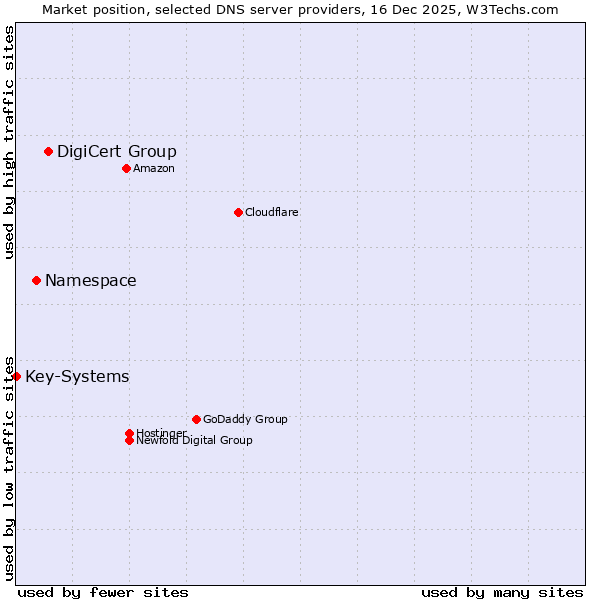 TechnologiesContent ManagementServer-side Languages Client-side Languages JavaScript Libraries CSS Frameworks Web Servers Web Panels Operating Systems Web Hosting Data Centers Reverse Proxies DNS Servers Email Servers SSL Certificate Authorities Content Delivery Traffic Analysis Tools Advertising Networks Tag Managers Social Widgets Site Elements Structured Data Markup Languages Character Encodings Image File Formats Top Level Domains Server Locations Content Languages | Technologies > DNS Servers > Technology usage comparison Comparison of the usage statistics of DigiCert Group vs. Namespace vs. Key-Systems for websitesThis report shows the usage statistics of DigiCert Group vs. Namespace vs. Key-Systems as DNS server provider on the web. See technologies overview for explanations on the methodologies used in the surveys. Our reports are updated daily. UsageThis diagram shows the percentages of websites using the selected technologies. How to read the diagram: