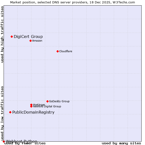 TechnologiesContent ManagementServer-side Languages Client-side Languages JavaScript Libraries CSS Frameworks Web Servers Web Panels Operating Systems Web Hosting Data Centers Reverse Proxies DNS Servers Email Servers SSL Certificate Authorities Content Delivery Traffic Analysis Tools Advertising Networks Tag Managers Social Widgets Site Elements Structured Data Markup Languages Character Encodings Image File Formats Top Level Domains Server Locations Content Languages | Technologies > DNS Servers > Technology usage comparison Comparison of the usage statistics of DigiCert Group vs. PublicDomainRegistry vs. Webhost Python for websitesThis report shows the usage statistics of DigiCert Group vs. PublicDomainRegistry vs. Webhost Python as DNS server provider on the web. See technologies overview for explanations on the methodologies used in the surveys. Our reports are updated daily. UsageThis diagram shows the percentages of websites using the selected technologies. How to read the diagram: