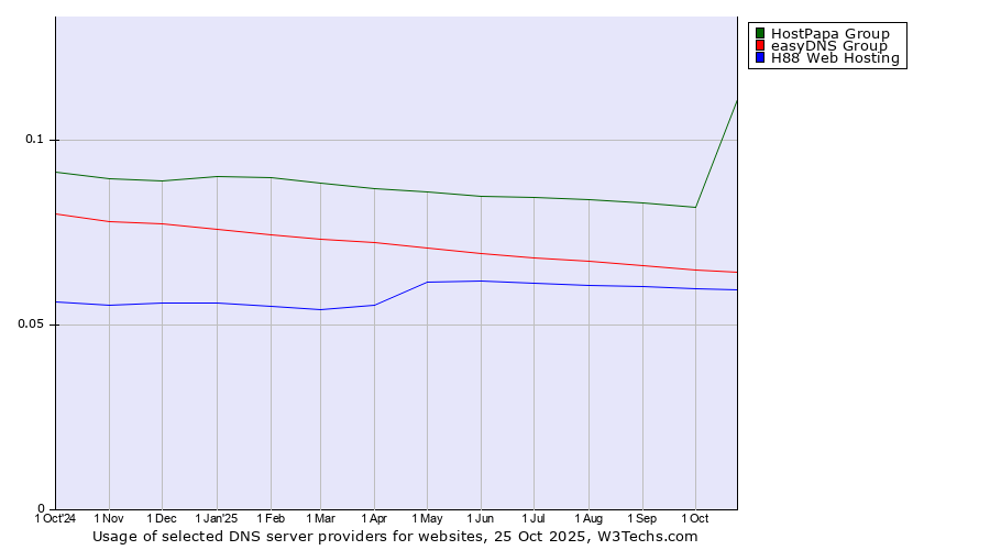 TechnologiesContent ManagementServer-side Languages Client-side Languages JavaScript Libraries CSS Frameworks Web Servers Web Panels Operating Systems Web Hosting Data Centers Reverse Proxies DNS Servers Email Servers SSL Certificate Authorities Content Delivery Traffic Analysis Tools Advertising Networks Tag Managers Social Widgets Site Elements Structured Data Markup Languages Character Encodings Image File Formats Top Level Domains Server Locations Content Languages | Technologies > DNS Servers > Technology usage comparison Comparison of the usage statistics of HostPapa Group vs. easyDNS Group vs. H88 Web Hosting for websitesThis report shows the usage statistics of HostPapa Group vs. easyDNS Group vs. H88 Web Hosting as DNS server provider on the web. See technologies overview for explanations on the methodologies used in the surveys. Our reports are updated daily. UsageThis diagram shows the percentages of websites using the selected technologies. How to read the diagram:
