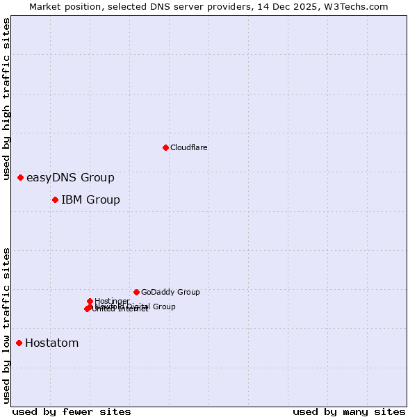TechnologiesContent ManagementServer-side Languages Client-side Languages JavaScript Libraries CSS Frameworks Web Servers Web Panels Operating Systems Web Hosting Data Centers Reverse Proxies DNS Servers Email Servers SSL Certificate Authorities Content Delivery Traffic Analysis Tools Advertising Networks Tag Managers Social Widgets Site Elements Structured Data Markup Languages Character Encodings Image File Formats Top Level Domains Server Locations Content Languages | Technologies > DNS Servers > Technology usage comparison Comparison of the usage statistics of IBM Group vs. easyDNS Group vs. Hostatom for websitesThis report shows the usage statistics of IBM Group vs. easyDNS Group vs. Hostatom as DNS server provider on the web. See technologies overview for explanations on the methodologies used in the surveys. Our reports are updated daily. UsageThis diagram shows the percentages of websites using the selected technologies. How to read the diagram: