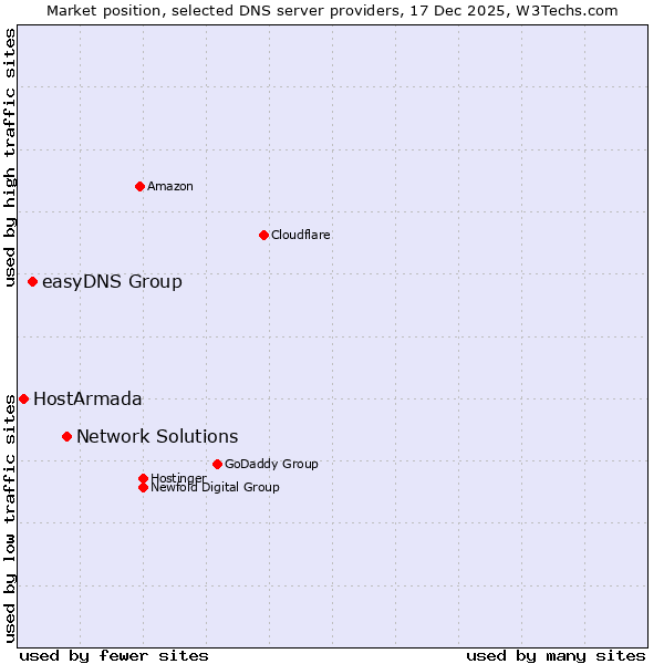 TechnologiesContent ManagementServer-side Languages Client-side Languages JavaScript Libraries CSS Frameworks Web Servers Web Panels Operating Systems Web Hosting Data Centers Reverse Proxies DNS Servers Email Servers SSL Certificate Authorities Content Delivery Traffic Analysis Tools Advertising Networks Tag Managers Social Widgets Site Elements Structured Data Markup Languages Character Encodings Image File Formats Top Level Domains Server Locations Content Languages | Technologies > DNS Servers > Technology usage comparison Comparison of the usage statistics of Network Solutions vs. easyDNS Group vs. HostArmada for websitesThis report shows the usage statistics of Network Solutions vs. easyDNS Group vs. HostArmada as DNS server provider on the web. See technologies overview for explanations on the methodologies used in the surveys. Our reports are updated daily. UsageThis diagram shows the percentages of websites using the selected technologies. How to read the diagram:
