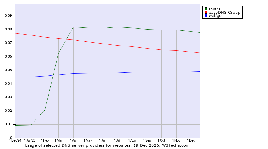 TechnologiesContent ManagementServer-side Languages Client-side Languages JavaScript Libraries CSS Frameworks Web Servers Web Panels Operating Systems Web Hosting Data Centers Reverse Proxies DNS Servers Email Servers SSL Certificate Authorities Content Delivery Traffic Analysis Tools Advertising Networks Tag Managers Social Widgets Site Elements Structured Data Markup Languages Character Encodings Image File Formats Top Level Domains Server Locations Content Languages | Technologies > DNS Servers > Technology usage comparison Comparison of the usage statistics of Instra vs. easyDNS Group vs. webgo for websitesThis report shows the usage statistics of Instra vs. easyDNS Group vs. webgo as DNS server provider on the web. See technologies overview for explanations on the methodologies used in the surveys. Our reports are updated daily. UsageThis diagram shows the percentages of websites using the selected technologies. How to read the diagram: