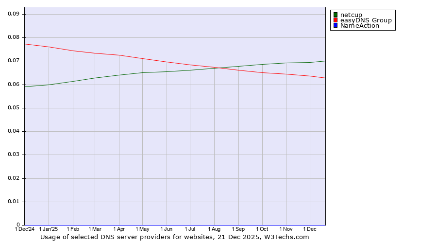 TechnologiesContent ManagementServer-side Languages Client-side Languages JavaScript Libraries CSS Frameworks Web Servers Web Panels Operating Systems Web Hosting Data Centers Reverse Proxies DNS Servers Email Servers SSL Certificate Authorities Content Delivery Traffic Analysis Tools Advertising Networks Tag Managers Social Widgets Site Elements Structured Data Markup Languages Character Encodings Image File Formats Top Level Domains Server Locations Content Languages | Technologies > DNS Servers > Technology usage comparison Comparison of the usage statistics of netcup vs. easyDNS Group vs. NameAction for websitesThis report shows the usage statistics of netcup vs. easyDNS Group vs. NameAction as DNS server provider on the web. See technologies overview for explanations on the methodologies used in the surveys. Our reports are updated daily. UsageThis diagram shows the percentages of websites using the selected technologies. How to read the diagram:
