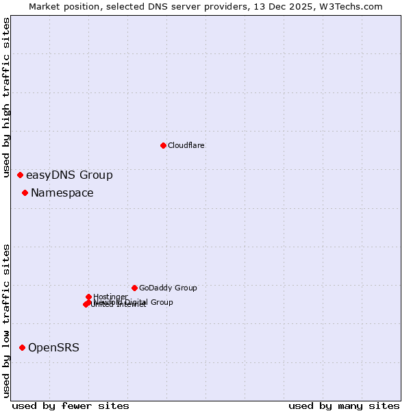TechnologiesContent ManagementServer-side Languages Client-side Languages JavaScript Libraries CSS Frameworks Web Servers Web Panels Operating Systems Web Hosting Data Centers Reverse Proxies DNS Servers Email Servers SSL Certificate Authorities Content Delivery Traffic Analysis Tools Advertising Networks Tag Managers Social Widgets Site Elements Structured Data Markup Languages Character Encodings Image File Formats Top Level Domains Server Locations Content Languages | Technologies > DNS Servers > Technology usage comparison Comparison of the usage statistics of Namespace vs. OpenSRS vs. easyDNS Group for websitesThis report shows the usage statistics of Namespace vs. OpenSRS vs. easyDNS Group as DNS server provider on the web. See technologies overview for explanations on the methodologies used in the surveys. Our reports are updated daily. UsageThis diagram shows the percentages of websites using the selected technologies. How to read the diagram:
