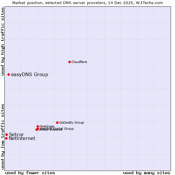 TechnologiesContent ManagementServer-side Languages Client-side Languages JavaScript Libraries CSS Frameworks Web Servers Web Panels Operating Systems Web Hosting Data Centers Reverse Proxies DNS Servers Email Servers SSL Certificate Authorities Content Delivery Traffic Analysis Tools Advertising Networks Tag Managers Social Widgets Site Elements Structured Data Markup Languages Character Encodings Image File Formats Top Level Domains Server Locations Content Languages | Technologies > DNS Servers > Technology usage comparison Comparison of the usage statistics of easyDNS Group vs. Setcor vs. Netinternet for websitesThis report shows the usage statistics of easyDNS Group vs. Setcor vs. Netinternet as DNS server provider on the web. See technologies overview for explanations on the methodologies used in the surveys. Our reports are updated daily. UsageThis diagram shows the percentages of websites using the selected technologies. How to read the diagram: