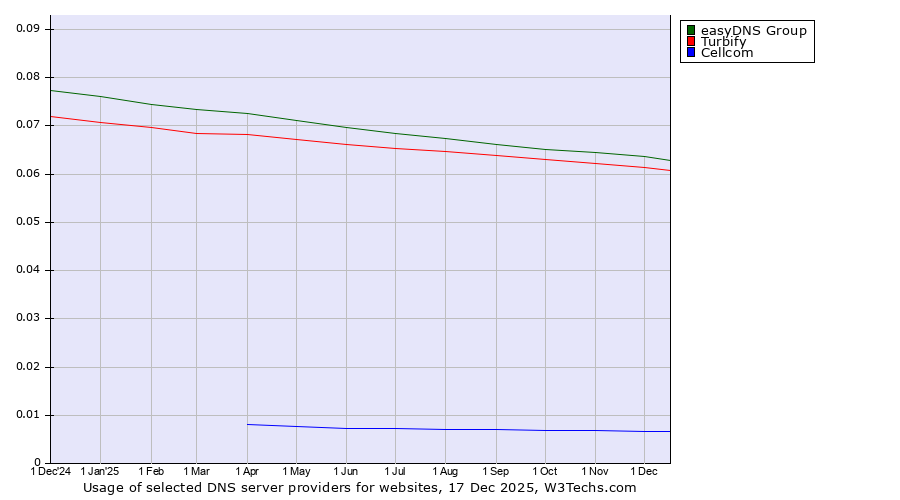 TechnologiesContent ManagementServer-side Languages Client-side Languages JavaScript Libraries CSS Frameworks Web Servers Web Panels Operating Systems Web Hosting Data Centers Reverse Proxies DNS Servers Email Servers SSL Certificate Authorities Content Delivery Traffic Analysis Tools Advertising Networks Tag Managers Social Widgets Site Elements Structured Data Markup Languages Character Encodings Image File Formats Top Level Domains Server Locations Content Languages | Technologies > DNS Servers > Technology usage comparison Comparison of the usage statistics of easyDNS Group vs. Turbify vs. Cellcom for websitesThis report shows the usage statistics of easyDNS Group vs. Turbify vs. Cellcom as DNS server provider on the web. See technologies overview for explanations on the methodologies used in the surveys. Our reports are updated daily. UsageThis diagram shows the percentages of websites using the selected technologies. How to read the diagram: