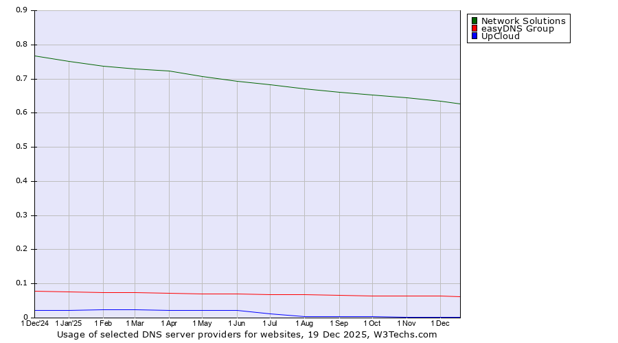 TechnologiesContent ManagementServer-side Languages Client-side Languages JavaScript Libraries CSS Frameworks Web Servers Web Panels Operating Systems Web Hosting Data Centers Reverse Proxies DNS Servers Email Servers SSL Certificate Authorities Content Delivery Traffic Analysis Tools Advertising Networks Tag Managers Social Widgets Site Elements Structured Data Markup Languages Character Encodings Image File Formats Top Level Domains Server Locations Content Languages | Technologies > DNS Servers > Technology usage comparison Comparison of the usage statistics of Network Solutions vs. easyDNS Group vs. UpCloud for websitesThis report shows the usage statistics of Network Solutions vs. easyDNS Group vs. UpCloud as DNS server provider on the web. See technologies overview for explanations on the methodologies used in the surveys. Our reports are updated daily. UsageThis diagram shows the percentages of websites using the selected technologies. How to read the diagram: