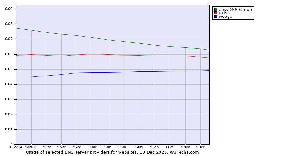 TechnologiesContent ManagementServer-side Languages Client-side Languages JavaScript Libraries CSS Frameworks Web Servers Web Panels Operating Systems Web Hosting Data Centers Reverse Proxies DNS Servers Email Servers SSL Certificate Authorities Content Delivery Traffic Analysis Tools Advertising Networks Tag Managers Social Widgets Site Elements Structured Data Markup Languages Character Encodings Image File Formats Top Level Domains Server Locations Content Languages | Technologies > DNS Servers > Technology usage comparison Comparison of the usage statistics of easyDNS Group vs. PTisp vs. webgo for websitesThis report shows the usage statistics of easyDNS Group vs. PTisp vs. webgo as DNS server provider on the web. See technologies overview for explanations on the methodologies used in the surveys. Our reports are updated daily. UsageThis diagram shows the percentages of websites using the selected technologies. How to read the diagram: