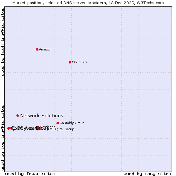 TechnologiesContent ManagementServer-side Languages Client-side Languages JavaScript Libraries CSS Frameworks Web Servers Web Panels Operating Systems Web Hosting Data Centers Reverse Proxies DNS Servers Email Servers SSL Certificate Authorities Content Delivery Traffic Analysis Tools Advertising Networks Tag Managers Social Widgets Site Elements Structured Data Markup Languages Character Encodings Image File Formats Top Level Domains Server Locations Content Languages | Technologies > DNS Servers > Technology usage comparison Comparison of the usage statistics of Network Solutions vs. Exabytes Group vs. QUIC.cloud for websitesThis report shows the usage statistics of Network Solutions vs. Exabytes Group vs. QUIC.cloud as DNS server provider on the web. See technologies overview for explanations on the methodologies used in the surveys. Our reports are updated daily. UsageThis diagram shows the percentages of websites using the selected technologies. How to read the diagram: