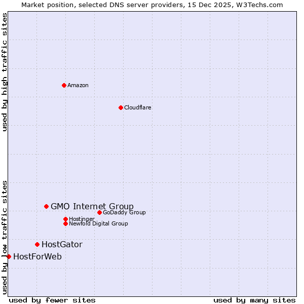 TechnologiesContent ManagementServer-side Languages Client-side Languages JavaScript Libraries CSS Frameworks Web Servers Web Panels Operating Systems Web Hosting Data Centers Reverse Proxies DNS Servers Email Servers SSL Certificate Authorities Content Delivery Traffic Analysis Tools Advertising Networks Tag Managers Social Widgets Site Elements Structured Data Markup Languages Character Encodings Image File Formats Top Level Domains Server Locations Content Languages | Technologies > DNS Servers > Technology usage comparison Comparison of the usage statistics of GMO Internet Group vs. HostGator vs. HostForWeb for websitesThis report shows the usage statistics of GMO Internet Group vs. HostGator vs. HostForWeb as DNS server provider on the web. See technologies overview for explanations on the methodologies used in the surveys. Our reports are updated daily. UsageThis diagram shows the percentages of websites using the selected technologies. How to read the diagram:
