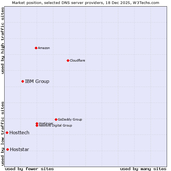 TechnologiesContent ManagementServer-side Languages Client-side Languages JavaScript Libraries CSS Frameworks Web Servers Web Panels Operating Systems Web Hosting Data Centers Reverse Proxies DNS Servers Email Servers SSL Certificate Authorities Content Delivery Traffic Analysis Tools Advertising Networks Tag Managers Social Widgets Site Elements Structured Data Markup Languages Character Encodings Image File Formats Top Level Domains Server Locations Content Languages | Technologies > DNS Servers > Technology usage comparison Comparison of the usage statistics of IBM Group vs. Hoststar vs. Hosttech for websitesThis report shows the usage statistics of IBM Group vs. Hoststar vs. Hosttech as DNS server provider on the web. See technologies overview for explanations on the methodologies used in the surveys. Our reports are updated daily. UsageThis diagram shows the percentages of websites using the selected technologies. How to read the diagram: