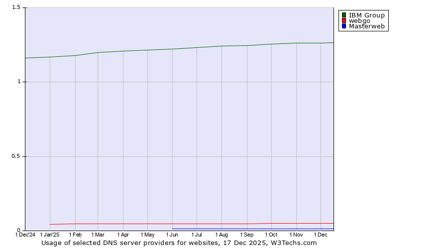TechnologiesContent ManagementServer-side Languages Client-side Languages JavaScript Libraries CSS Frameworks Web Servers Web Panels Operating Systems Web Hosting Data Centers Reverse Proxies DNS Servers Email Servers SSL Certificate Authorities Content Delivery Traffic Analysis Tools Advertising Networks Tag Managers Social Widgets Site Elements Structured Data Markup Languages Character Encodings Image File Formats Top Level Domains Server Locations Content Languages | Technologies > DNS Servers > Technology usage comparison Comparison of the usage statistics of IBM Group vs. webgo vs. Masterweb for websitesThis report shows the usage statistics of IBM Group vs. webgo vs. Masterweb as DNS server provider on the web. See technologies overview for explanations on the methodologies used in the surveys. Our reports are updated daily. UsageThis diagram shows the percentages of websites using the selected technologies. How to read the diagram: