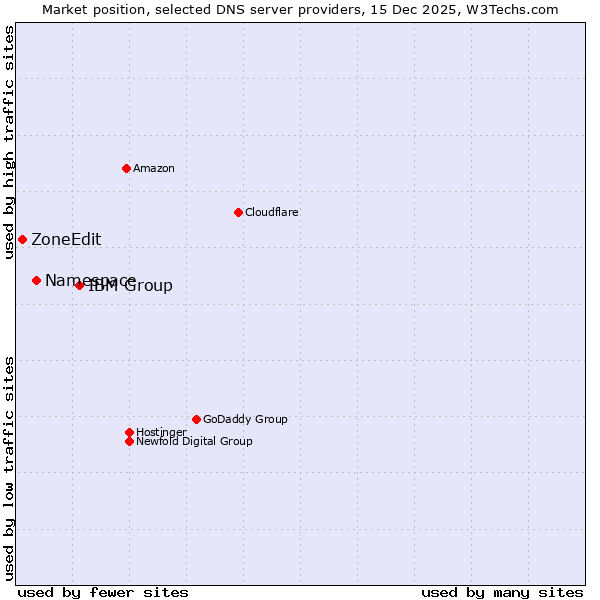 TechnologiesContent ManagementServer-side Languages Client-side Languages JavaScript Libraries CSS Frameworks Web Servers Web Panels Operating Systems Web Hosting Data Centers Reverse Proxies DNS Servers Email Servers SSL Certificate Authorities Content Delivery Traffic Analysis Tools Advertising Networks Tag Managers Social Widgets Site Elements Structured Data Markup Languages Character Encodings Image File Formats Top Level Domains Server Locations Content Languages | Technologies > DNS Servers > Technology usage comparison Comparison of the usage statistics of IBM Group vs. Namespace vs. ZoneEdit for websitesThis report shows the usage statistics of IBM Group vs. Namespace vs. ZoneEdit as DNS server provider on the web. See technologies overview for explanations on the methodologies used in the surveys. Our reports are updated daily. UsageThis diagram shows the percentages of websites using the selected technologies. How to read the diagram: