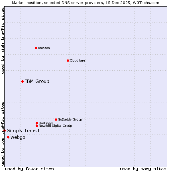 TechnologiesContent ManagementServer-side Languages Client-side Languages JavaScript Libraries CSS Frameworks Web Servers Web Panels Operating Systems Web Hosting Data Centers Reverse Proxies DNS Servers Email Servers SSL Certificate Authorities Content Delivery Traffic Analysis Tools Advertising Networks Tag Managers Social Widgets Site Elements Structured Data Markup Languages Character Encodings Image File Formats Top Level Domains Server Locations Content Languages | Technologies > DNS Servers > Technology usage comparison Comparison of the usage statistics of IBM Group vs. webgo vs. Simply Transit for websitesThis report shows the usage statistics of IBM Group vs. webgo vs. Simply Transit as DNS server provider on the web. See technologies overview for explanations on the methodologies used in the surveys. Our reports are updated daily. UsageThis diagram shows the percentages of websites using the selected technologies. How to read the diagram: