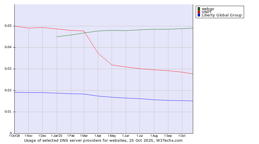TechnologiesContent ManagementServer-side Languages Client-side Languages JavaScript Libraries CSS Frameworks Web Servers Web Panels Operating Systems Web Hosting Data Centers Reverse Proxies DNS Servers Email Servers SSL Certificate Authorities Content Delivery Traffic Analysis Tools Advertising Networks Tag Managers Social Widgets Site Elements Structured Data Markup Languages Character Encodings Image File Formats Top Level Domains Server Locations Content Languages | Technologies > DNS Servers > Technology usage comparison Comparison of the usage statistics of webgo vs. VNPT vs. Liberty Global Group for websitesThis report shows the usage statistics of webgo vs. VNPT vs. Liberty Global Group as DNS server provider on the web. See technologies overview for explanations on the methodologies used in the surveys. Our reports are updated daily. UsageThis diagram shows the percentages of websites using the selected technologies. How to read the diagram:
