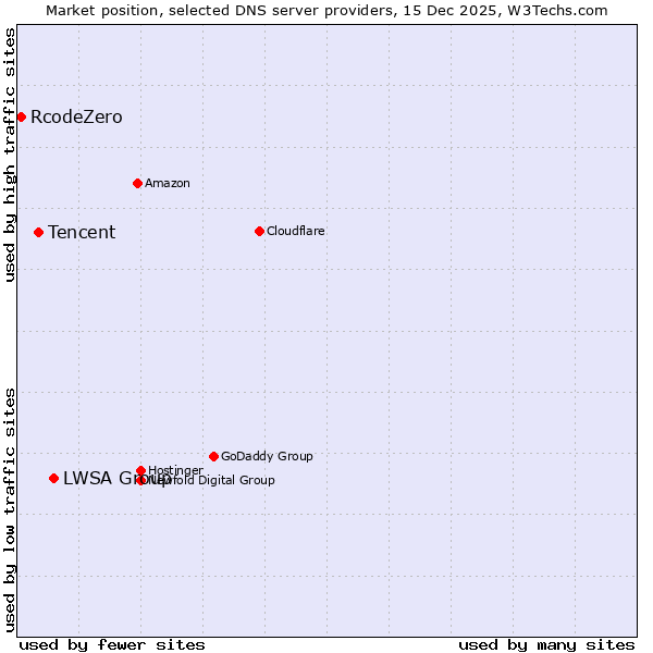 TechnologiesContent ManagementServer-side Languages Client-side Languages JavaScript Libraries CSS Frameworks Web Servers Web Panels Operating Systems Web Hosting Data Centers Reverse Proxies DNS Servers Email Servers SSL Certificate Authorities Content Delivery Traffic Analysis Tools Advertising Networks Tag Managers Social Widgets Site Elements Structured Data Markup Languages Character Encodings Image File Formats Top Level Domains Server Locations Content Languages | Technologies > DNS Servers > Technology usage comparison Comparison of the usage statistics of LWSA Group vs. Tencent vs. RcodeZero for websitesThis report shows the usage statistics of LWSA Group vs. Tencent vs. RcodeZero as DNS server provider on the web. See technologies overview for explanations on the methodologies used in the surveys. Our reports are updated daily. UsageThis diagram shows the percentages of websites using the selected technologies. How to read the diagram: