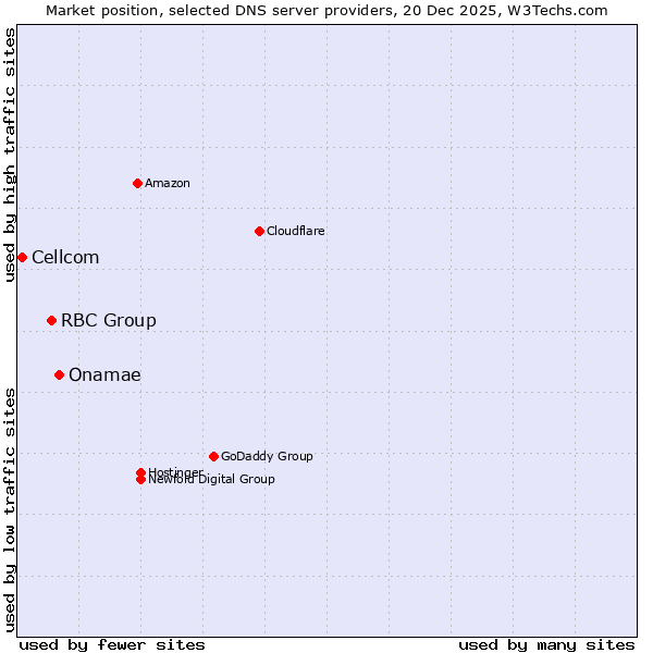 TechnologiesContent ManagementServer-side Languages Client-side Languages JavaScript Libraries CSS Frameworks Web Servers Web Panels Operating Systems Web Hosting Data Centers Reverse Proxies DNS Servers Email Servers SSL Certificate Authorities Content Delivery Traffic Analysis Tools Advertising Networks Tag Managers Social Widgets Site Elements Structured Data Markup Languages Character Encodings Image File Formats Top Level Domains Server Locations Content Languages | Technologies > DNS Servers > Technology usage comparison Comparison of the usage statistics of Onamae vs. RBC Group vs. Cellcom for websitesThis report shows the usage statistics of Onamae vs. RBC Group vs. Cellcom as DNS server provider on the web. See technologies overview for explanations on the methodologies used in the surveys. Our reports are updated daily. UsageThis diagram shows the percentages of websites using the selected technologies. How to read the diagram: