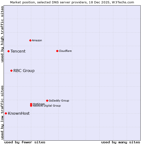 TechnologiesContent ManagementServer-side Languages Client-side Languages JavaScript Libraries CSS Frameworks Web Servers Web Panels Operating Systems Web Hosting Data Centers Reverse Proxies DNS Servers Email Servers SSL Certificate Authorities Content Delivery Traffic Analysis Tools Advertising Networks Tag Managers Social Widgets Site Elements Structured Data Markup Languages Character Encodings Image File Formats Top Level Domains Server Locations Content Languages | Technologies > DNS Servers > Technology usage comparison Comparison of the usage statistics of RBC Group vs. Tencent vs. KnownHost for websitesThis report shows the usage statistics of RBC Group vs. Tencent vs. KnownHost as DNS server provider on the web. See technologies overview for explanations on the methodologies used in the surveys. Our reports are updated daily. UsageThis diagram shows the percentages of websites using the selected technologies. How to read the diagram: