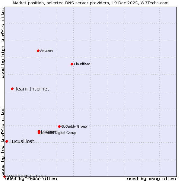 TechnologiesContent ManagementServer-side Languages Client-side Languages JavaScript Libraries CSS Frameworks Web Servers Web Panels Operating Systems Web Hosting Data Centers Reverse Proxies DNS Servers Email Servers SSL Certificate Authorities Content Delivery Traffic Analysis Tools Advertising Networks Tag Managers Social Widgets Site Elements Structured Data Markup Languages Character Encodings Image File Formats Top Level Domains Server Locations Content Languages | Technologies > DNS Servers > Technology usage comparison Comparison of the usage statistics of Team Internet vs. LucusHost vs. Webhost Python for websitesThis report shows the usage statistics of Team Internet vs. LucusHost vs. Webhost Python as DNS server provider on the web. See technologies overview for explanations on the methodologies used in the surveys. Our reports are updated daily. UsageThis diagram shows the percentages of websites using the selected technologies. How to read the diagram: